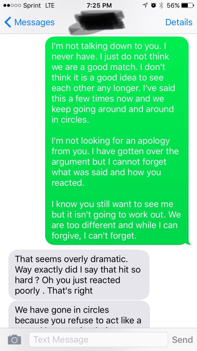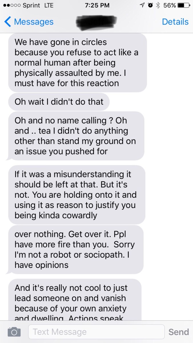 Alarms went off inside me immediately!  My tone changed from annoyed and determined to calm and docile, attempting to settle him down. This dude was out of his damn mind!! I didn’t want to be anywhere in his vicinity if he was true to his word. He legit scared me because I honestly did not know him well enough to know if he was just talking out of his ass or if he was for real. I continued to talk him down while we were on the phone until he arrived at work and had to end the call.  When he texted me a day or two later, I continued to reiterate that I didn’t think we were a good match. He proceeded to blow my phone up. Walls of texts were sent of him arguing aggressively about wanting to continue to see me.