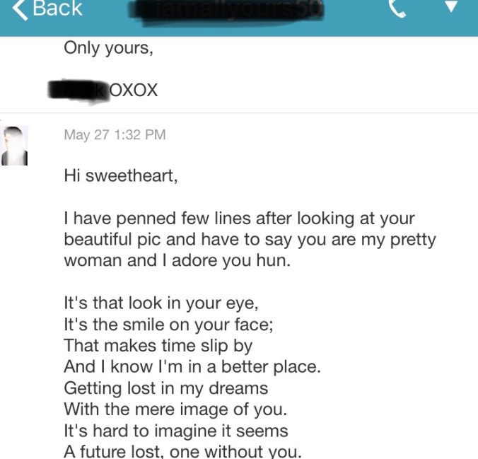 She wrote me back within 15 minutes of writing her. She asked to see what I had and I sent her everything. Screen shots of his profile on the dating app, our texts, everything. She had some questions and I answered anything she needed to know and then I wished her good luck.