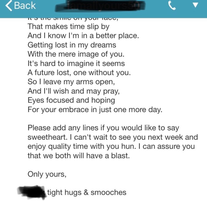 He apologized for disappearing. Said that he lost a friend to suicide but that he still wanted to meet me if I could forgive his disappearance. My gut said that he was lying but it was such a sensitive subject, I couldn’t bring myself to call him out. I told him I’d have to think about. I discussed it with friends and I decided that I’d give him another chance. He said he would flying in to SFO on the 16th and that he wanted to see me that night. I agreed to meet him and, in the mean time, we wrote back and forth every day. When the 16th arrived, he confirmed with me at 5:00 that he would see me at 7:00.